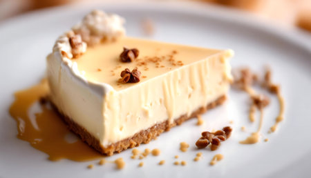 AI Generated. Delicious slice of caramel cheesecake topped with chocolate covered nuts on a white plate