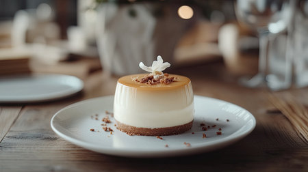 A visually appealing dessert features a creamy texture topped with caramel and delicate floral decor, set on a rustic wooden table, exuding elegance.