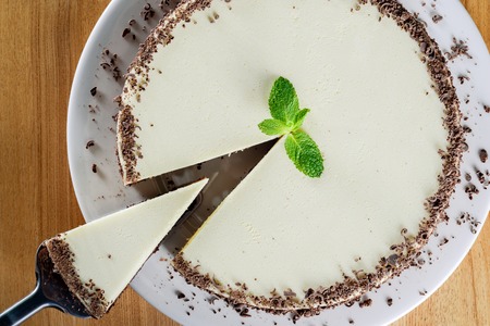 Cheesecake with chocolate topping decorated with mint on white plate