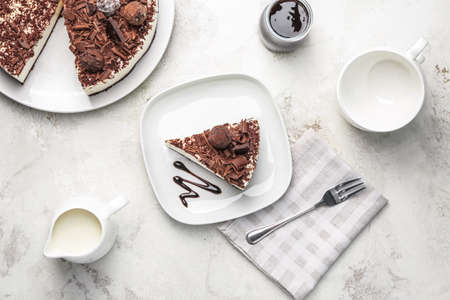 Slice of no baked creamy cheesecake with chocolate glaze and almond, light concrete background. Selective focus.