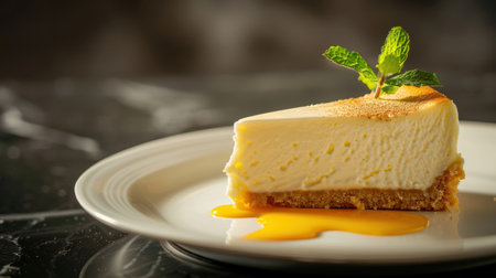 A close-up image of a slice of creamy cheesecake with a mint garnish, served on a white plate with orange sauce. The cheesecake is light and fluffy, with a golden crust, and the orange sauce adds a touch of sweetness and tanginess. The mint garnish adds a fresh, aromatic touch to the dessert.