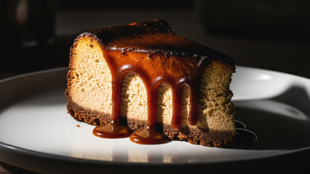 A single slice of cheesecake sits on a white plate. Rich caramel sauce cascades down the side, contrasting with the cake's textured surface. The composition is lit with dramatic overhead lighting. This image is suitable for various commercial uses, including culinary and dessert-themed projects.