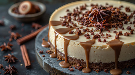 Close-up of a creamy cheesecake slice, drizzled with caramel and garnished with star anise. A delicious dessert.