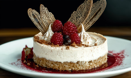 Delicious raspberry cheesecake dessert with decorative garnish.