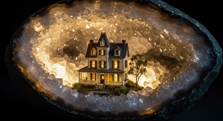 A miniature house glows warmly inside a large, illuminated geode crystal. A surreal and magical concept representing home, p