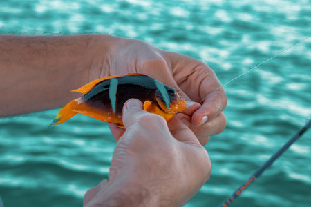 A fisherman carefully holds a beautiful Red Sea clownfish in his hands after catching it revealing its vibrant orange and black colors against the turquoise sea water
