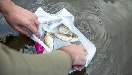 Close up Man in checkered shirt with rolled up sleeves caught a fish and puts it in green fishing grid on a shore of lake on a blurred background. Lifestyle, recreation, fisherman leisure concept