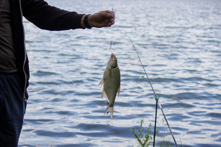 Fisher man holding in his hand caught, river fish on the background of the river.
