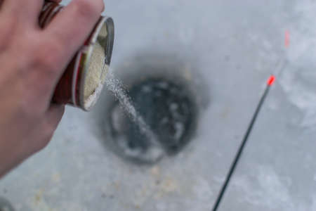 Close up Men's hands hold a small box with maggots and put bait on the hook to fish with a fishing rod on a blurred background shrubs and reeds. Lifestyle, fisherman recreation, leisure concept