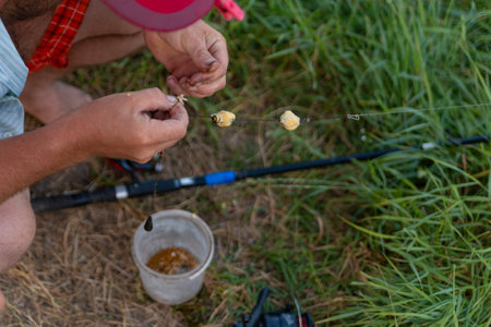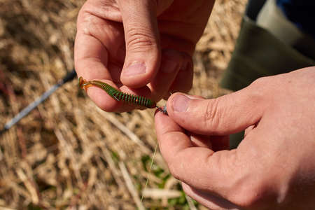 fishing on the river a man puts a bait for catching fish, selective focus. Nature