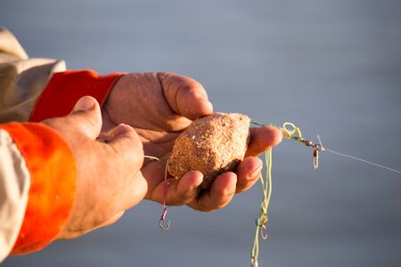 Fishing in the autumn. Fisherman prepares bait for feeder fishing.