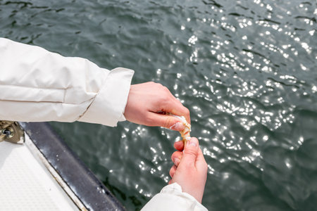 Close-up of a fisherman putting on bait with fishing equipment box. Fishing and sport concept.