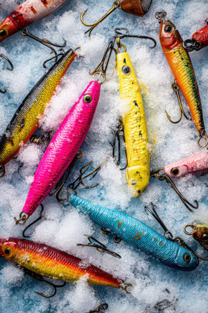 A collection of bright fishing lures and hooks displays vivid colors against a snowy backdrop, capturing winter sports excitement in detail.