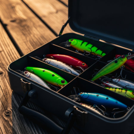 Colorful fishing lures arranged meticulously in a tackle box on a sunny day by the dock at the lake