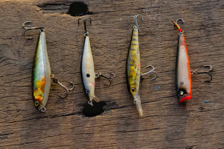 many colorful lures for fishing on the wooden pier. Selective focus. nature