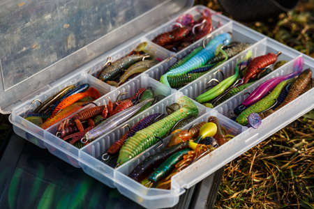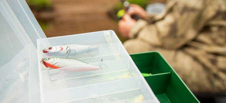 Fishing lures in a box on a wooden surface. Fishing tackle.