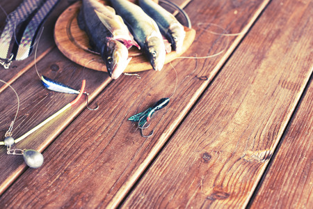 Fishing tackle on a wooden background. Studio photo with vignetting.
