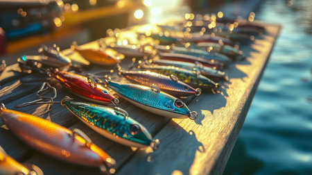 A variety of colorful fishing lures arranged neatly on a wooden dock at sunset near a tranquil waterway