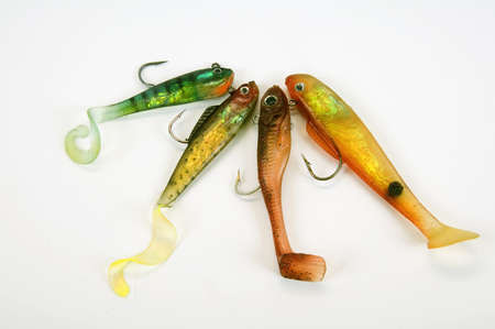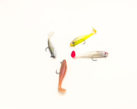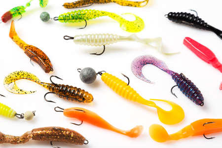 Colorful silicone plastic fishing baits isolated on white background. Selective focus.