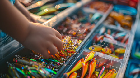 Choosing Colorful Fishing Lures at a Vibrant Tackle Shop During a Sunny Afternoon by the Lake. Generative AI