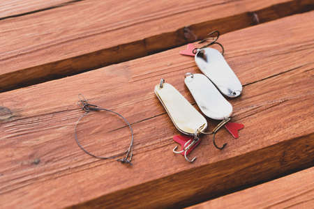 Fishing tackle - fishing spinning, hooks and lures on wooden table.