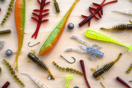 Colorful silicone fishing baits with plummets on wooden table. Various fish and worms and crayfish. Toned image and top view. Stock background, photo