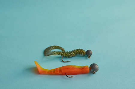 Fishing lures. Vibrohvost and twisters closeup on blue background