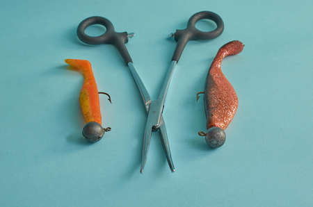 Fishing equipment. Two fishing vibrotails and a pair of scissors to extract the hook close up on a blue background