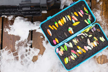 Set of spinners, wobblers, silicone baits, hooks for fisherman. Winter, spring fishing on paid snow covered ice pond,lake in country club.Catching fish with rods.Men's hobby,entertainment,competition.