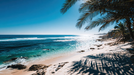 A bright tropical scene shows turquoise water gently lapping at a sandy shore with palm trees casting shadows in sunlight.