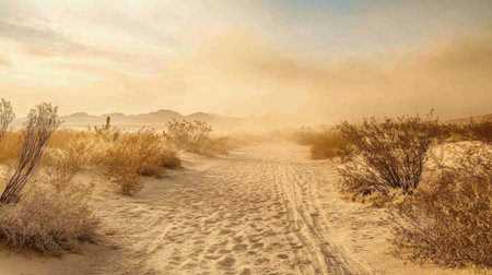 This image captures a tranquil desert landscape at dusk, featuring gentle dust clouds and sparse vegetation. The warm tones of sunset provide a beautiful backdrop.