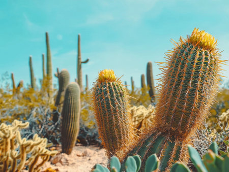 Stunning photograph showcasing a vibrant cactus garden thriving in an arid desert landscape under the bright rays of a sunny day The various cacti species with their spiky and prickly textures