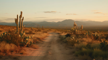 Generative AI, lonely road in the desert, aesthetic, muted neutral colors, cacti plants