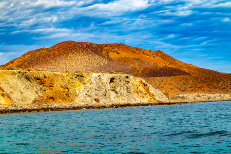 Hilly landscape on Mexican coast of Coronado Island, sparse vegetation, blue sky with white clouds in background, Loreto Bay National Marine Park in Baja California Sur, Mexico