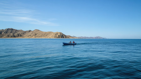 Fishermen in small boats in the distance, illustrating the delicate balance between human activity and the vaquita's fragile ecosystem.