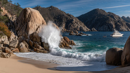 A dramatic seascape featuring a powerful white wave exploding against large granite boulders on a sandy shore. In the distance, a luxury yacht floats on the calm blue sea.