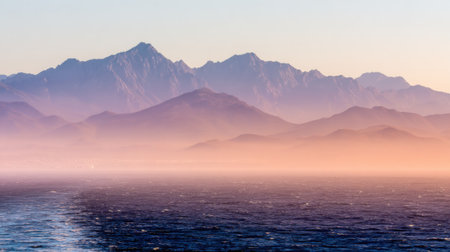 Ocean ripples at sunrise with misty mountains and wispy clouds in the sky. Clear details and vibrant colors en...