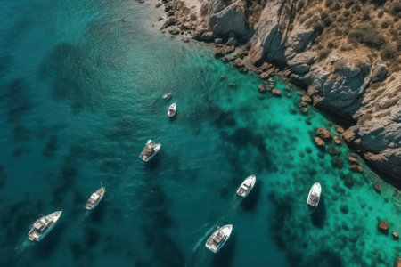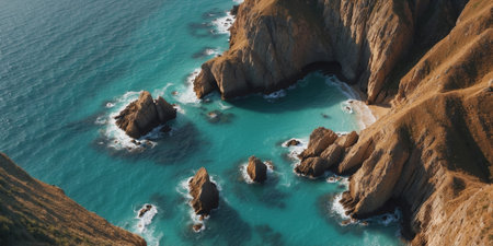 AI Generated. Drone perspective of craggy coastal cliffs and turquoise sea