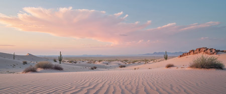 AI Generated. desert landscape is bathed in soft colors of dawn as first light of day gently tints sky with shades of pink and orange