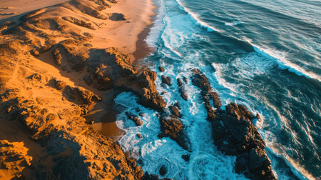 Aerial Photography, aerial view of the Namib Desert meeting the Atlantic Ocean, dramatic interplay of land and sea, orange sands against deep blue ocean, natural boundary.