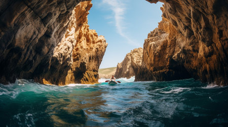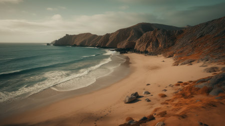 Idyllic coastline majestically eroded by breaking waves, a natural beauty generated by artificial intelligence