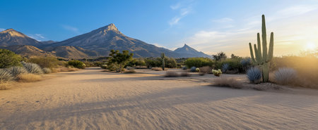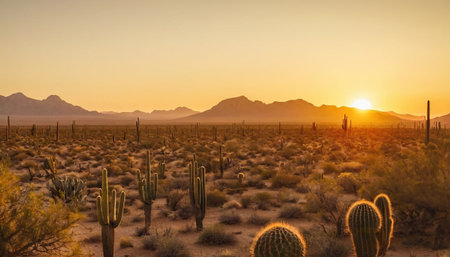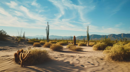 A captivating desert landscape featuring mountains, cacti, and a clear blue sky