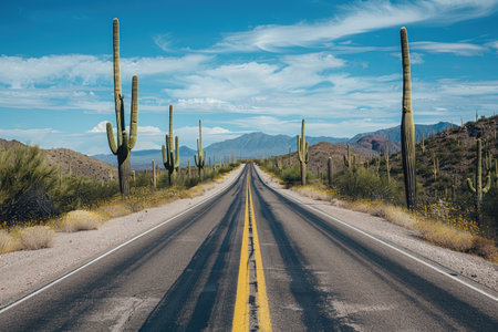 An endless road cuts through the heart of a vast desert landscape, lined with cactus plants against the hot desert sun.