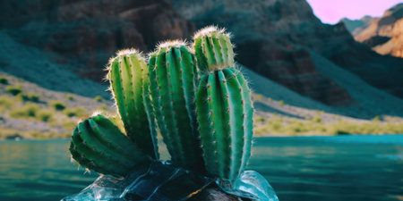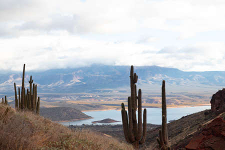 Saguaro cactus with lake landscape background in Arizona, USA