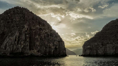 Sun on the background of mountains and the sea. Fjords of the Musandam Peninsula. Khasab bay. Oman