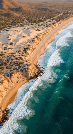 Aerial view of a sandy beach and ocean waves at sunset, South Australia