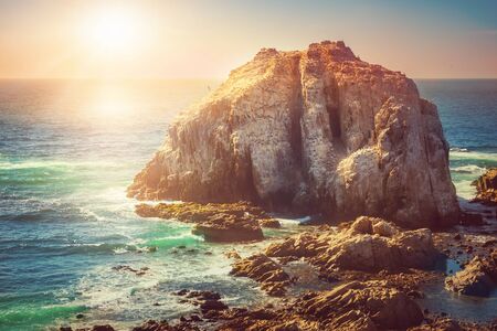 Rocky island with birds near coastilne of pacific ocean in Chile at sunset