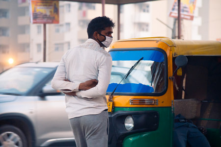 auto rickshaw driver in india standing wearing a mask with a infected person lying down in the vehicle as they search for medicine, hospital during the deadly coronavirus covid19 pandemic