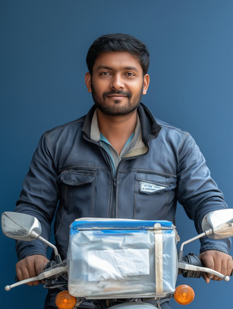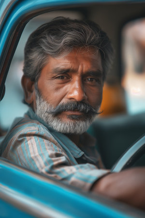 Close-up portrait of a young Indian male taxi driver with a friendly expression, sitting in the driver's seat of a taxi.