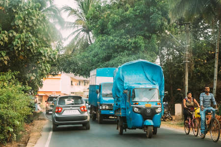 Goa, India. Auto Rickshaw Or Tuk-tuk Moving On Street In Sunny Day.